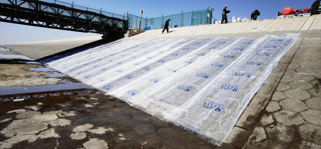 混凝土節(jié)水保濕養(yǎng)護(hù)膜,是以新型可控高分子吸水材料為核心,以塑料薄膜為載體,通過設(shè)備加工復(fù)合而成的卷材產(chǎn)品。其中高分子材料可吸收自重200倍的水分子, 吸水膨脹后變成透明的晶狀體,把液態(tài)水變成固態(tài)水,每平方米養(yǎng)護(hù)膜可蓄水0.5KG,成為一個固態(tài)的微型水庫,然后通過毛細(xì)管的作用向混凝土養(yǎng)護(hù)面滲透, 同時不斷吸收混凝土在水化過程中產(chǎn)生的蒸發(fā)水,因此在一個養(yǎng)護(hù)期內(nèi)總能保持混凝土表面濕潤。